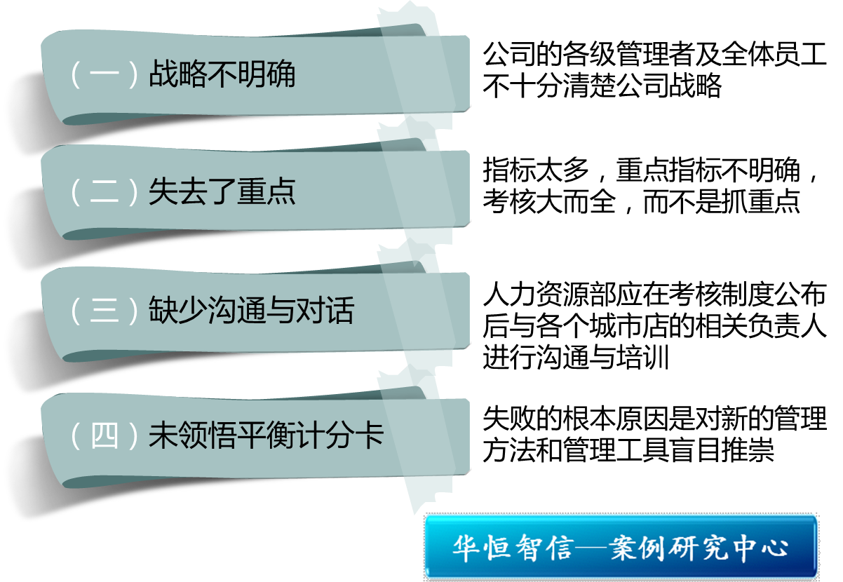失败的根本原因是对新的管理方法和管理工具盲目推崇,认为它们是企业的救命稻草,不加消化就拿来使用,导致失败。现在国内一些企业盲目追捧国外最先进的管理工具,但是一拿到中国就水土不服,最先进的不一定是最适用的。国外的一些成功实施平衡计分卡的公司,都是先从公司的使命愿景出发,通过分析,确定企业应该采取的战略,然后利用平衡计分卡,找出战略实施的关键成功因素,从四个方面来确定关键的绩效指标,然后再将这些指标逐步分解到每一个部门、每一位员工。