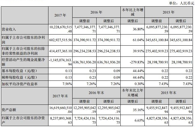 兆驰股份聚焦主业,整合业务领域的优势资源、稳步扩张,扎实推进各项工作,2017年实现营业收入为102.29亿元,较去年同期增长36.80%;实现利润总额7.00亿元,较去年同期增长63.76%;实现归属于上市公司股东的净利润为6.03亿元,较去年同期增长61.04%。随着公司业务板块不断扩张,资产规模进一步扩大,截止2017年12月31日,公司总资产166.20亿元,较上年末增长了35.16%;归属于上市公司股东的净资产为82.38亿元,较上年末增长了6.65%。