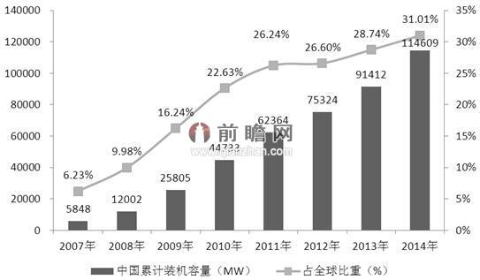 2007-2014年中国风电累计装机容量及在全球所占比重(单位:MW,%)
