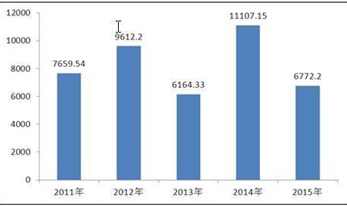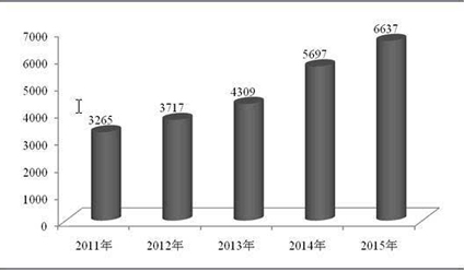 图表1:2011-2015年中国天然气勘查新增探明地质储量(单位:亿立方米)