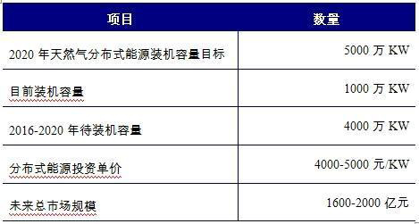 根据《关于发展天然气分布式能源的指导意见》,我国将建设1000个左右天然气分布式能源项目,拟建设10个左右各类典型特征的分布式能源示范区域。到2020年,在全国规模以上城市推广使用分布式能源系统,装机规模达到5000万千瓦,初步实现分布式能源装备产业化。按4000元/千瓦的投资计算,需投资2000亿元。