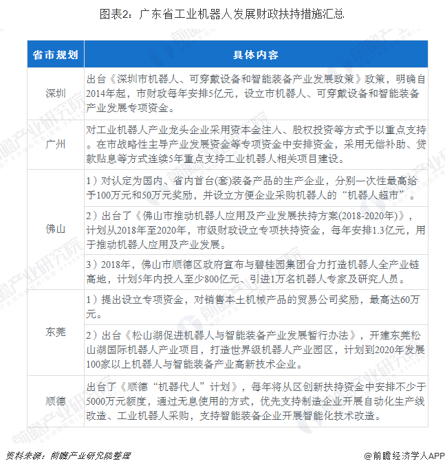 广东之所以能够取得如此出色的成果,并成为现阶段归纳机器人产业发展的重要高地,离不开国家政策的带动和落实。广东省是早一批通过“机器换人”寻求制造业转型出路的省份之一,为了促进机器人产业的快速发展,从2014年开始,深圳、广州、东莞、佛山等地就相继出台了多项相关鼓励政策。