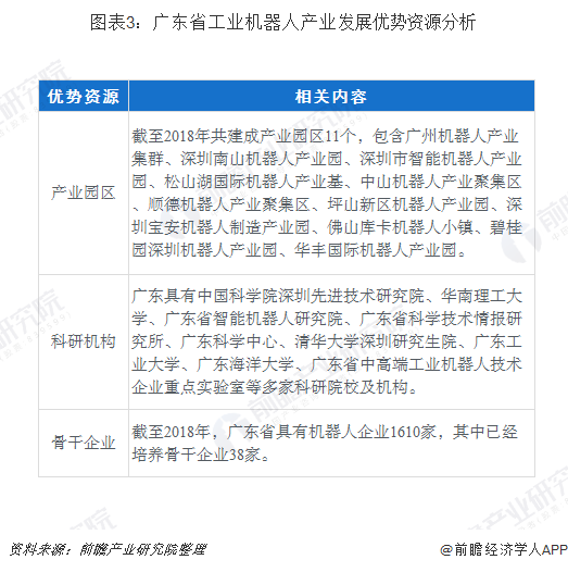 目前,广东省已形成广州佛山工业机器人与系统集成、深圳东莞机器人关键零部件配套等多个机器人产业集群,具备中国科学院深圳先进技术研究院、华南理工大学、广东省智能机器人研究院、广东省科学技术情报研究所、广东科学中心、清华大学深圳研究生院、广东工业大学、广东海洋大学、广东省中高端工业机器人技术企业重点实验室等多家科研院校及机构。