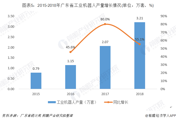 2018年,全国共生产工业机器人14.8万台(套),同比增长了,12.7%,而广东2018年工业机器人产量达3.21万台(套),同比增长了55.1%。换言之,2018年,广东工业机器人产量占全国总量约21.7%,增速也快于全国平均增幅。