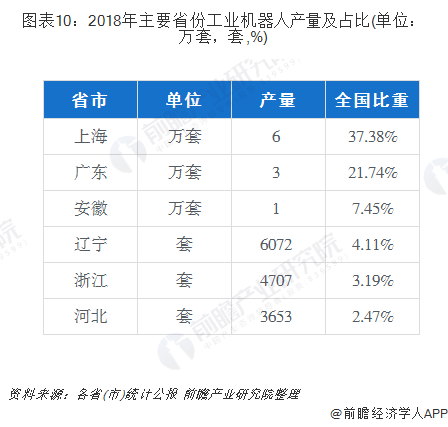 根据主要省份统计公报数据显示:2018年上海工业机器人产量为5.52万套,在国内处于前列。其次是广东3.21万套,安徽为1.1万套。