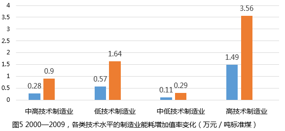 分行业看,高技术和低技术制造业的能源利用效率较高,增长速度较慢;中等技术制造业的能源利用效率较低,增长速度较快。如图5所示,2000—2009年,中高技术制造业的能耗增加值率从0.28万元/吨标准煤增长到0.9万元/吨标准煤,增长了约2.3倍;低技术制造业从0.57万元/吨标准煤提高到1.64万元/吨标准煤,增长了约2倍;中低技术制造业从0.11万元/吨标准煤增加到0.29万元/吨标准煤,增长了约1.6倍;高技术制造业增长速度最慢,从1.49万元/吨标准煤提升到3.56万元/吨标准煤,增长了1.4倍。