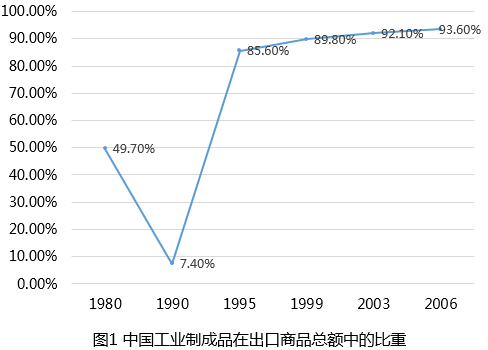 联合国工业发展组织的统计报告显示,2009年中国在世界工业生产总值中份额达到15.6%,仅次于美国19%的份额居世界第二位。通过国际贸易,中国逐步融入全球国际分工体系之中,成为其中不可或缺的一员。在这一过程中,中国制造业的地位不断上升。中国工业制成品在出口商品总额中的比重,1980年为49.7%,1990年为7.4%,1995年为85.6%,1999年为89.8%,2003年为92.1%,在2006年上升到93.6%, 成为我国出口增长的主要动力。