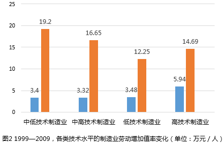 1999—2009年11年间,规模以上工业企业的劳动增加值率从3.7万元/人提高到16.6万元/人,增长了约3.5倍。分行业看,各类技术水平的制造业劳动增加值率都在快速提升。其中,中低技术制造业的劳动增加值率增长最快,其余依次为中高技术制造业、低技术制造业和高技术制造业。如图3所示,1999—2009年,中低技术制造业的劳动增加值率从3.40万元/人增长到19.20万元/人,增加了约4.6倍;中高技术制造业从3.32万元/人提升到16.65万元/人,增加了4倍;低技术制造业从3.48万元/人提升到12.25万元/人,增长了2.3倍;高技术制造业从5.94万元/人增加到14.69万元/人,增长了约1.5倍。2009年,中低技术制造业的劳动增加值率最高,其余依次为中高技术制造业、高技术制造业和低技术制造业。