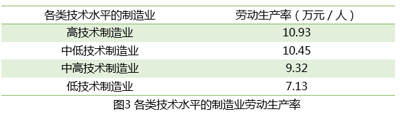 按照11年的平均值排序,高技术制造业的劳动生产率最高,达到10.9万元/人,中低技术制造业位居第二,为10.4万元/人;中高技术制造业和低技术制造业分别为9.3万元/人和7.2万元/人。数据显示,2006年以前,高技术制造业的劳动增加值率一直高于其他行业,2006年之后,中低技术和中高技术制造业的劳动增加值率超过了高技术行业,分别位居第一和第二,高技术制造业屈居第三。