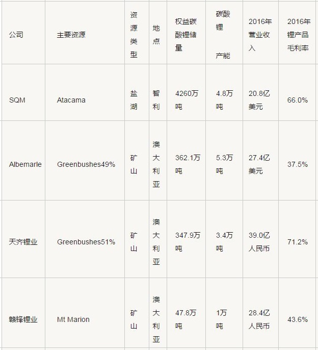 表4 锂业龙头企业