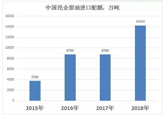 在2017年11月,商务部发布消息,2018年原油非国营贸易进口允许量升至14242万吨,这一数字同2017年比大涨63%。