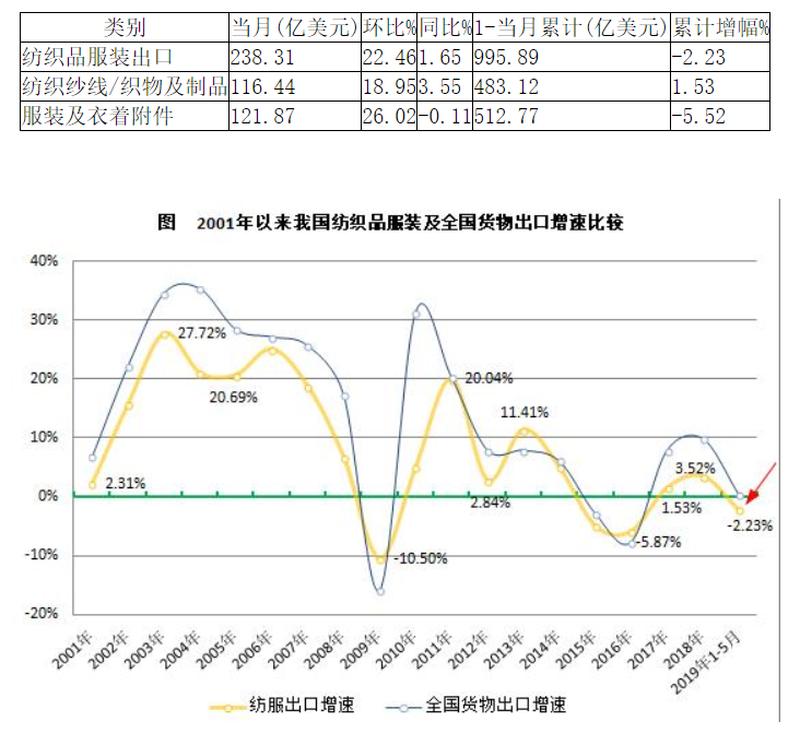 1-5月我国纺服出口同比下降2.23%
